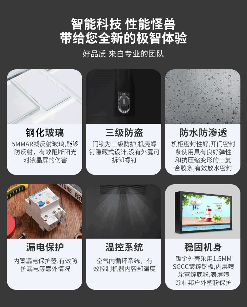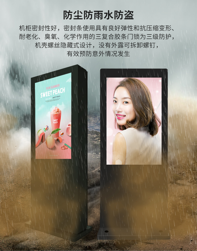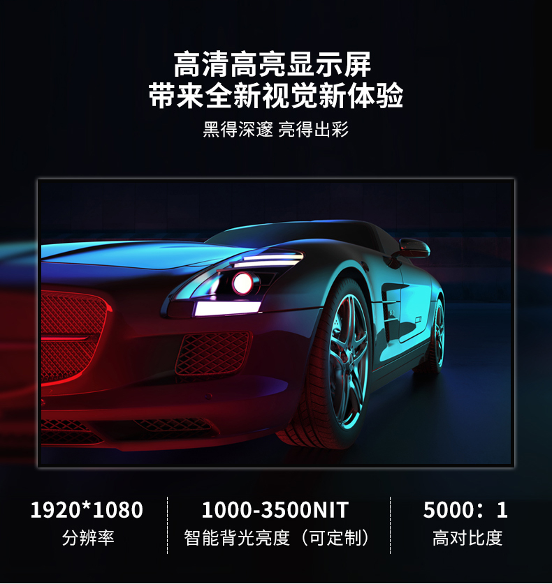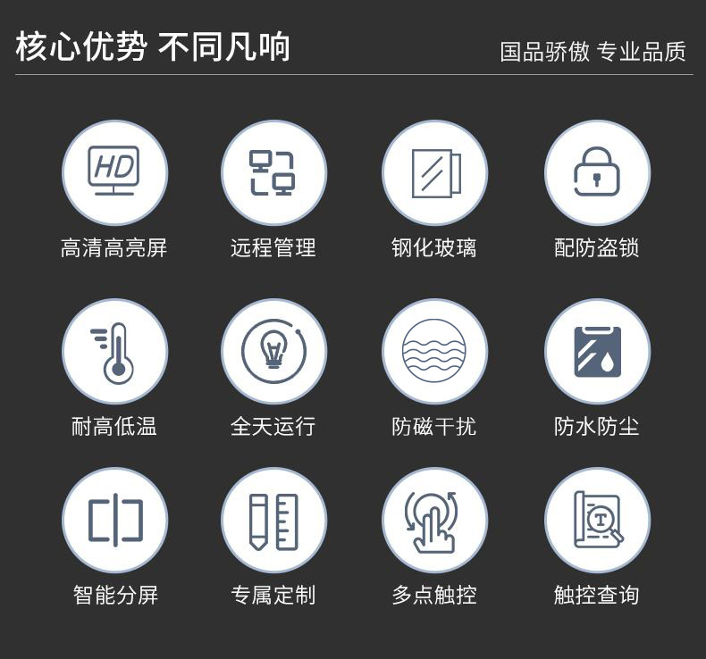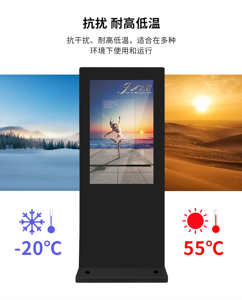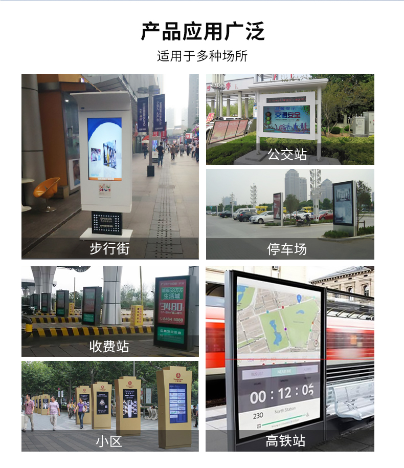 高清画质,色彩艳丽;高亮度,清晰显示;自动调节,不同的观看体验;防晒防爆,防尘防水;外观时尚大方,完美融入环境;低耗能,节能环保。