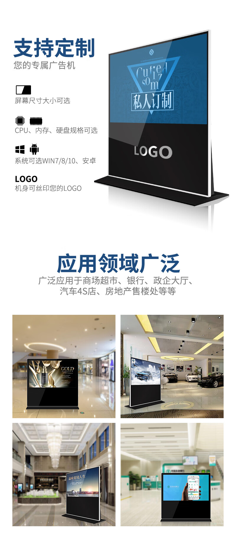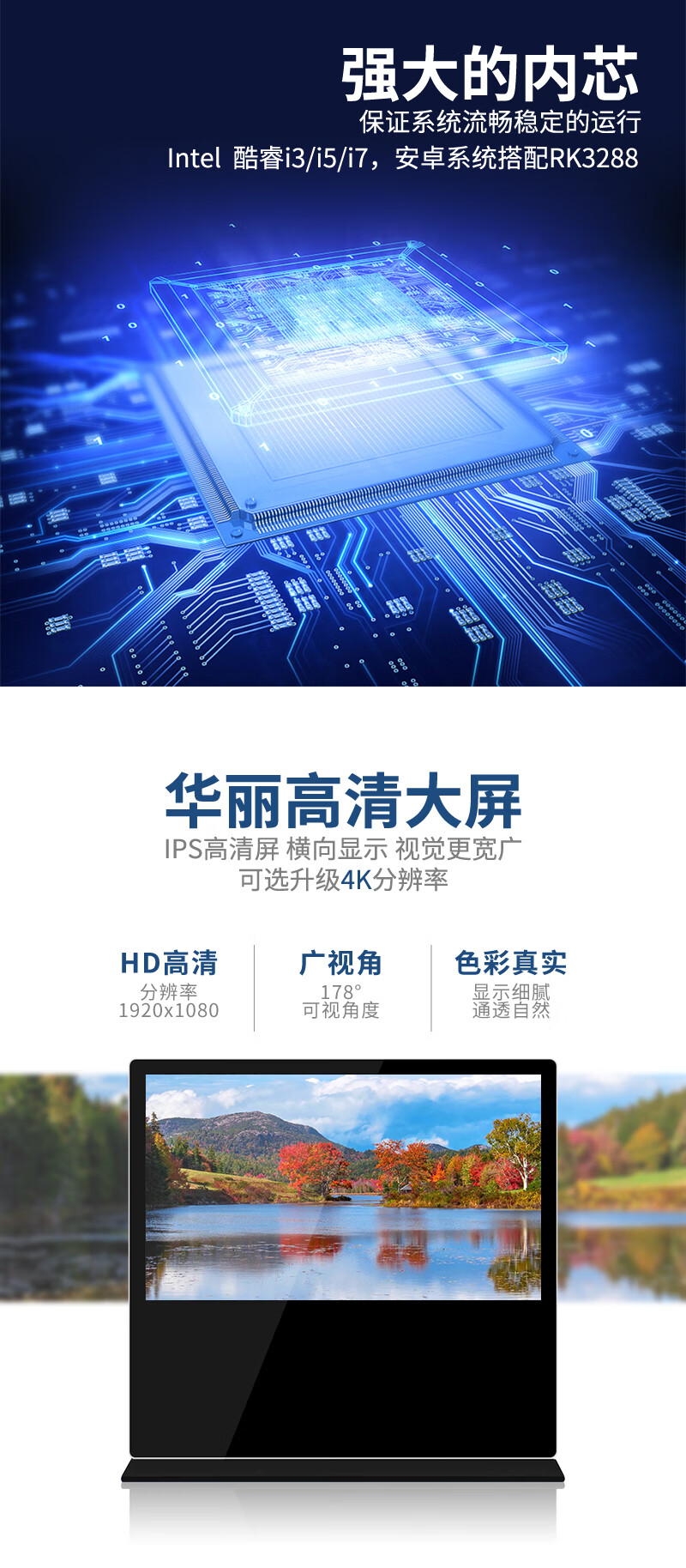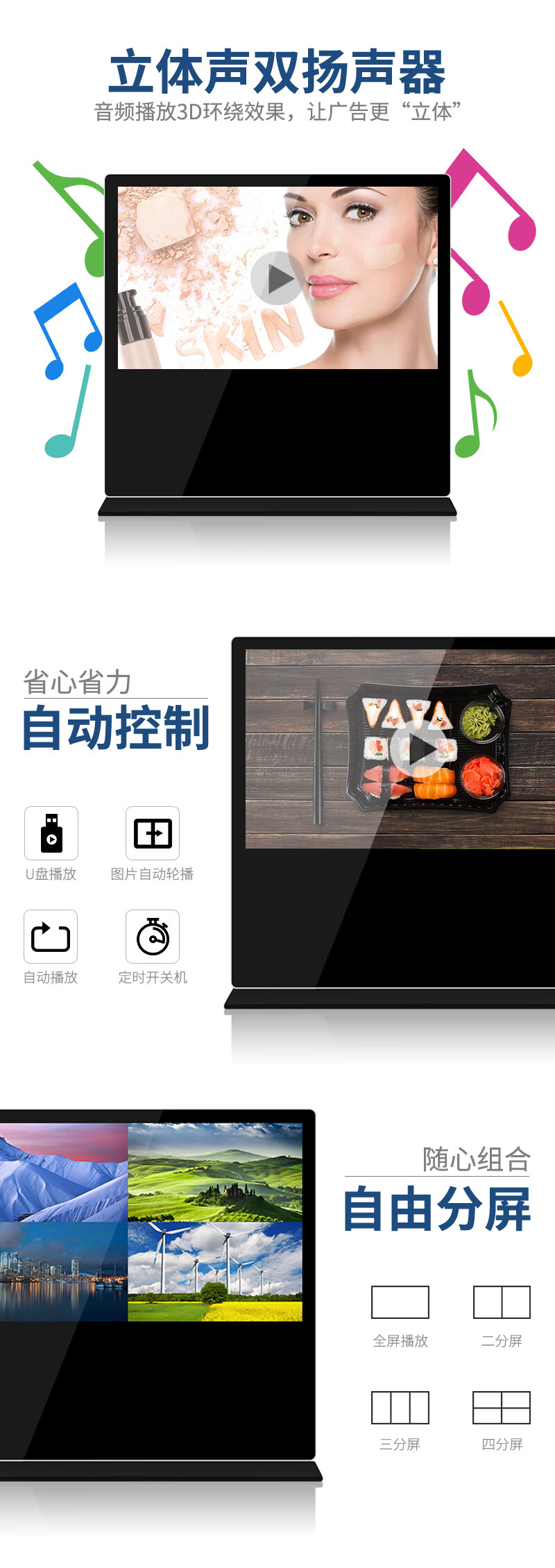 12 种分屏模式,支持自定义;一键设置定时播放,定时开关机;U 盘自动识别,图片 / 视频 / 音乐轮播;智能解码,兼容所有主流文件;1080P 全高清,16.7M 色彩等。