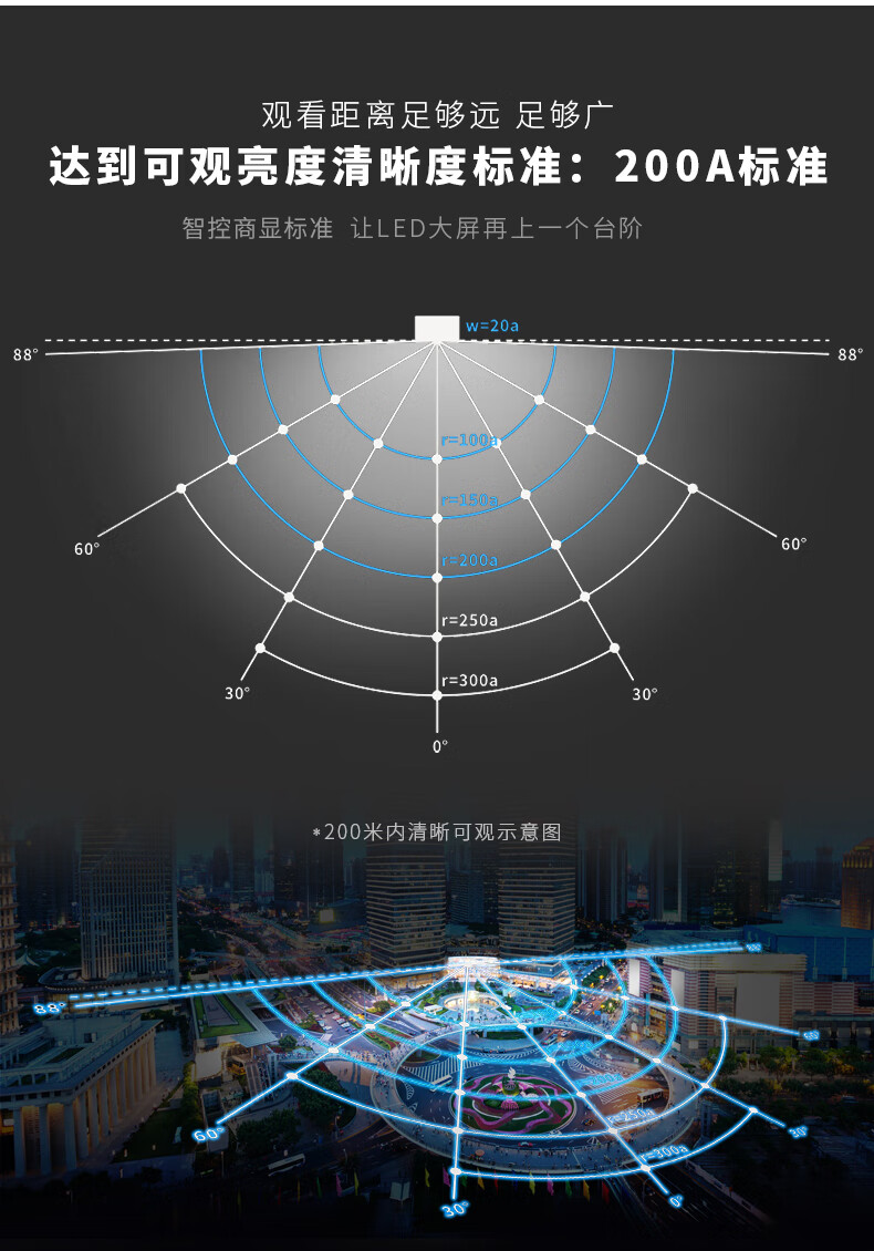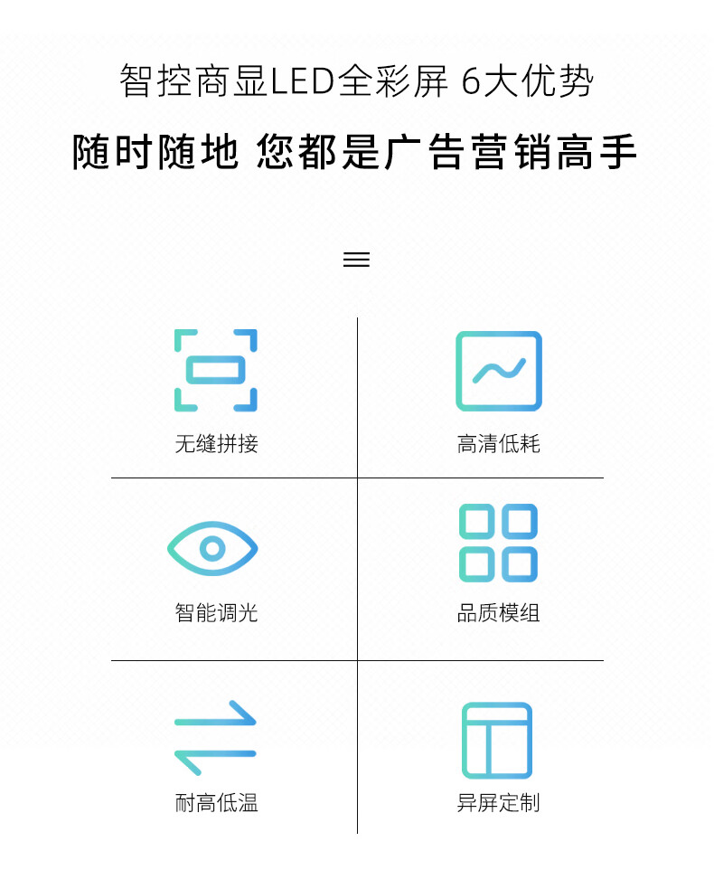 智控商显 LED 全彩屏采用的是当今最先进的 LED 控制技术,使得全彩屏价格更低、更节能、解析度更高、性能稳定、色彩更加丰富,不仅外观新颖独特,而且还可以随意调整大小。