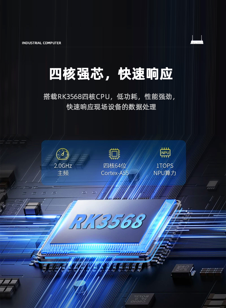 森克储能工控主机是一款搭载 RK3568CPU 的工业迷你主机,产品主频 2.0GHz,内置 1T 算力;工业级安规设计,通过多重可靠性验证。